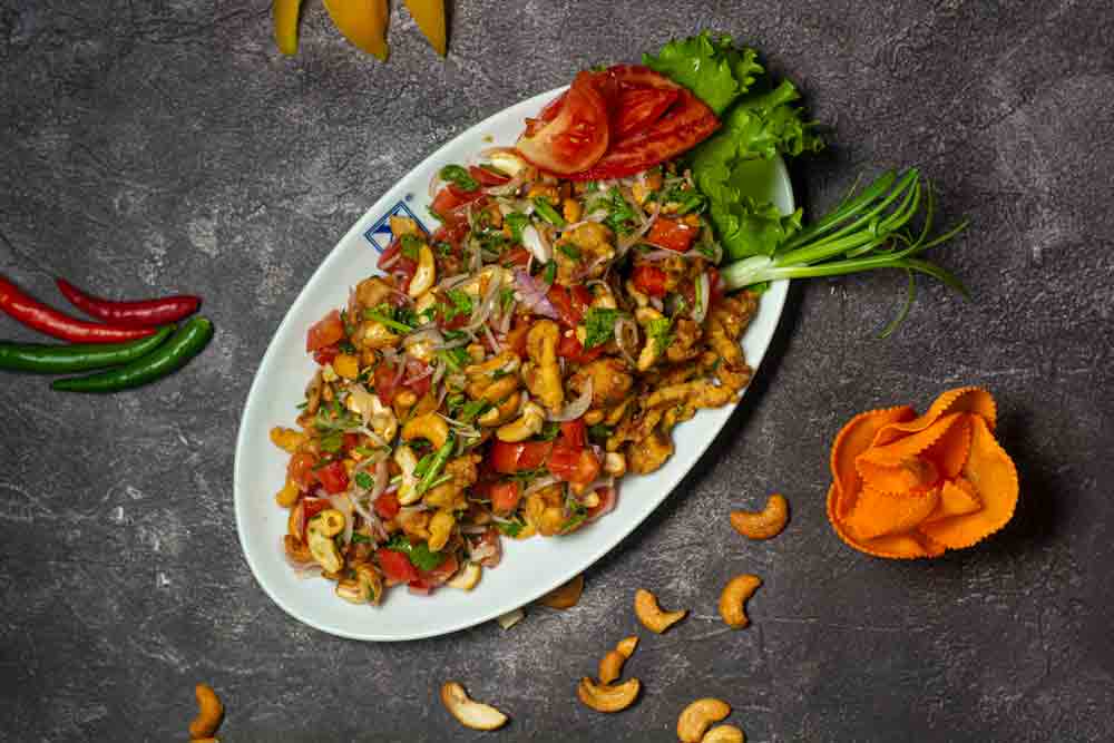 Spicy sliced chicken & prawn, roasted cashew nut, coriander, onion & tomato
