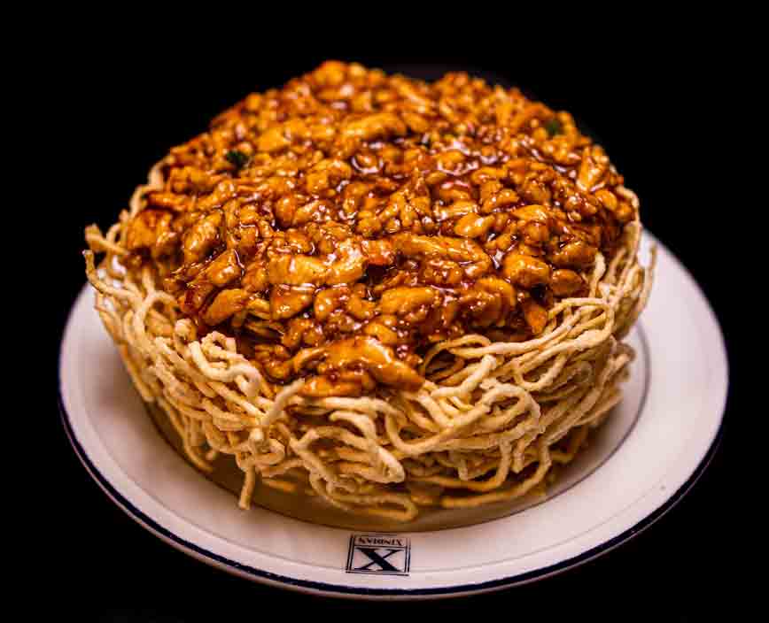 Crispy fried noodles serve with saucy sliced chicken & Julienne cut vegetable