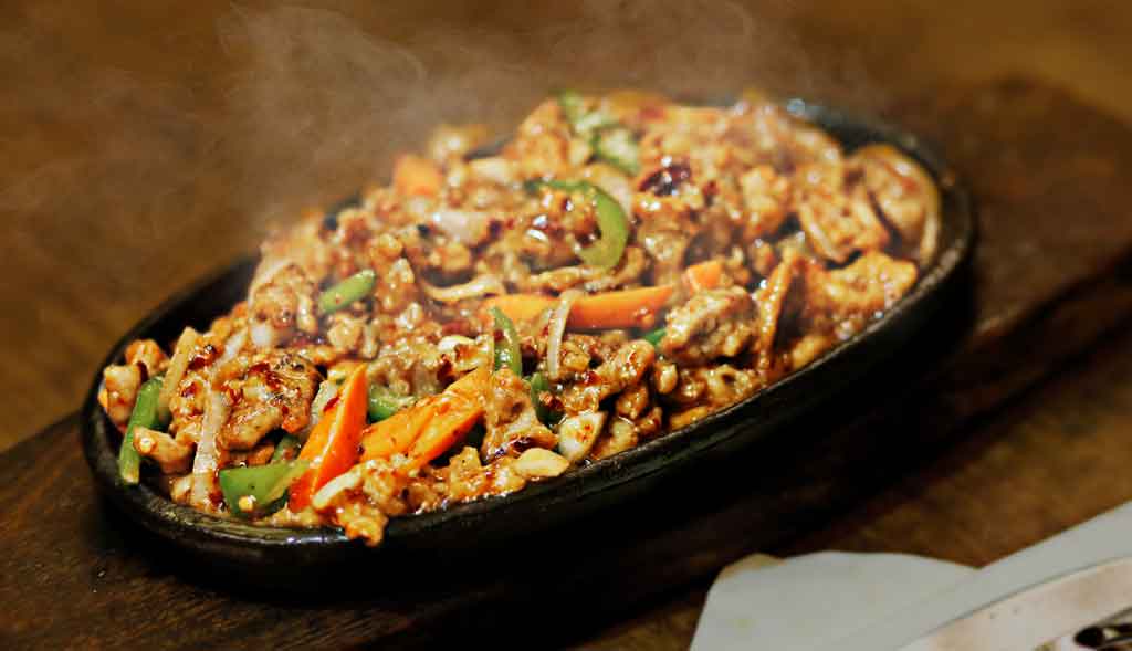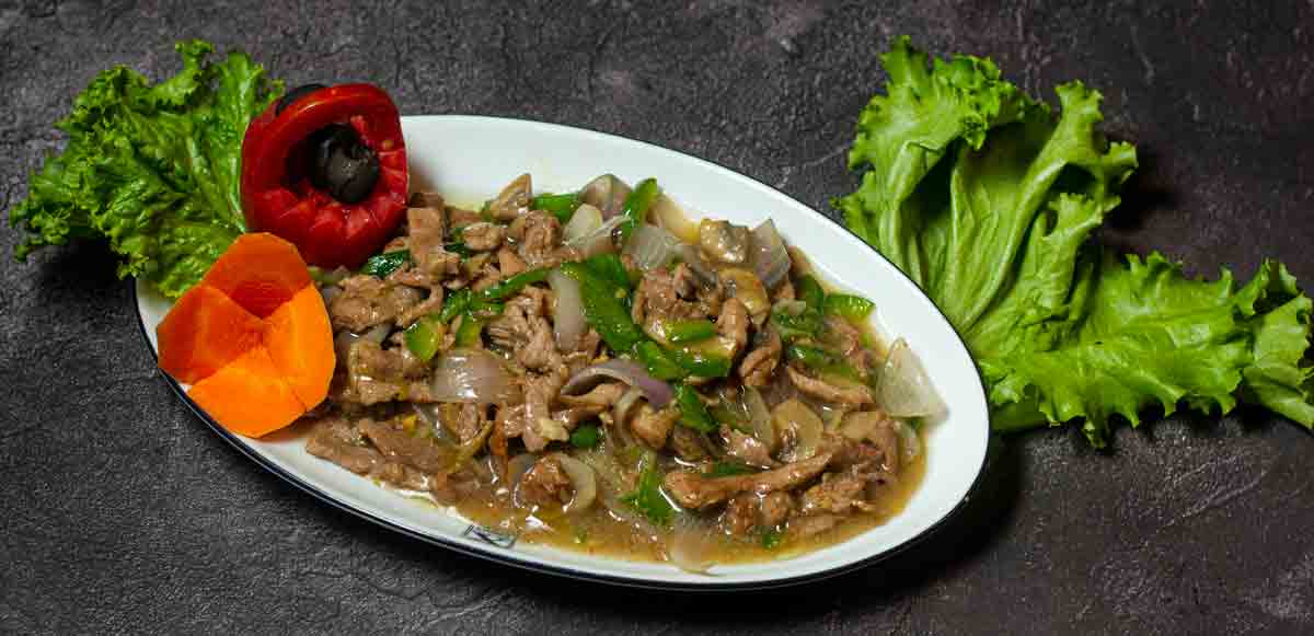 Sliced beef glazed in high heat and cooked with red chili, capsicum, c...